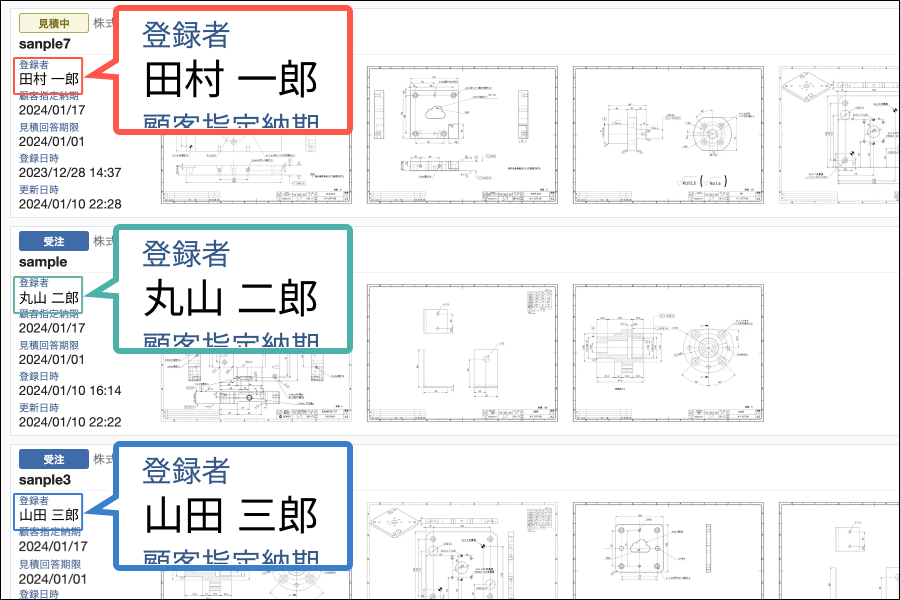 複数人で案件の登録・管理を行うことができます。これにより、引合い・受注案件の進捗管理も個人単位ではなくメンバー全員で把握することができます。