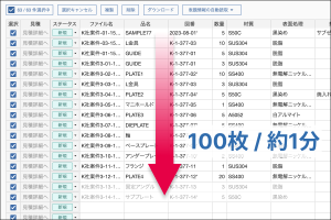 図面上にある品名や図番、数量、材質等の表題情報を自動で読み取り、最大100枚まで一括で登録することができます。