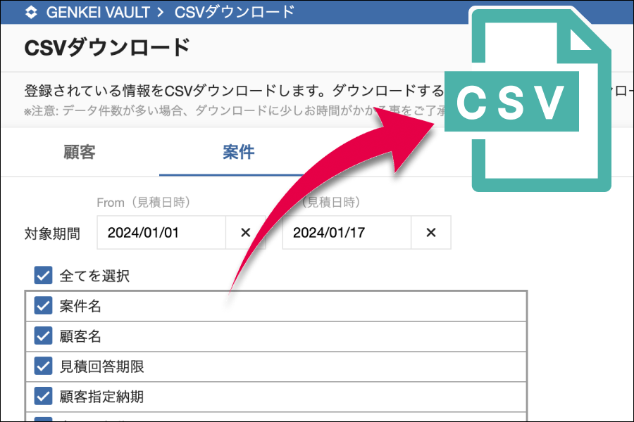 登録した案件に関する情報をCSVダウンロードすることができます。案件名や品名、加工費、材料費等の各費用、図面注記などから項目を指定してダウンロードすることができます。