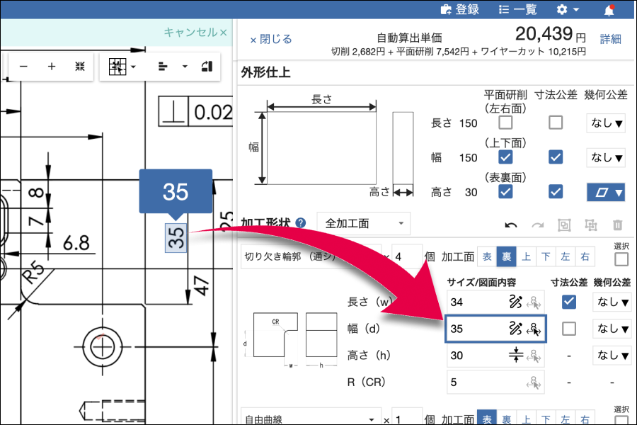 図面の情報を入力するだけで切削品の加工原価を計算することができます。寸法公差・幾何公差の公差指示にも対応しており、高精度な加工原価の見積りができます。