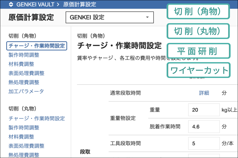 原価計算をする上で必要となるチャージや製造条件(加工機の性能など)を設定することができます。このカスタム機能を活用することで、自社環境に合わせた原価計算をおこなうことができます。
